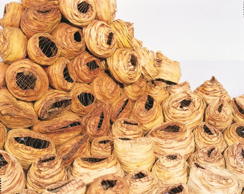 “Elisa D’Arrigo makes bounteous constructions with cloth, paint and thread, composed of small unites linked in honeycombed arrangements that suggest celluar growth…. Aside from suggesting nature’s exuberant hand, the repetition of the units into an assembled mass is also intended, the artist says, to invoke the idea of votive shrines. And it works: the earthy connects with the spiritual in these intense pieces.”