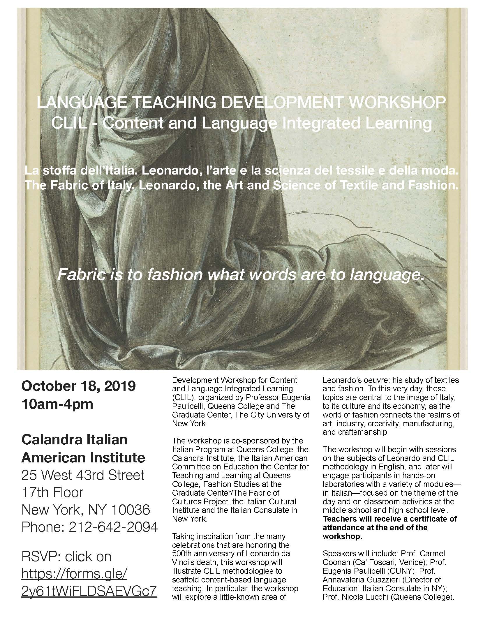 The workshop is co-sponsored by the Italian Program at Queens College, the Calandra Institute, the Italian American Committee on Education the Center for Teaching and Learning at Queens College, Fashion Studies at the Graduate Center/The Fabric of Cultures Project, the Italian Cultural Institute and the Italian Consulate in New York. Taking inspiration from the many celebrations that are honoring the 500th anniversary of Leonardo da Vinci’s death, this workshop will illustrate CLIL methodologies to scaffold content-based language teaching. In particular, the workshop will explore a little-known area of Leonardo’s oeuvre: his study of textiles and fashion. To this very day, these topics are central to the image of Italy, to its culture and its economy, as the world of fashion connects the realms of art, industry, creativity, manufacturing, and craftsmanship. The workshop will begin with sessions on the subjects of Leonardo and CLIL methodology in English, and later will engage participants in hands-on laboratories with a variety of modules— in Italian—focused on the theme of the day and on classroom activities at the middle school and high school level. Teachers will receive a certificate of attendance at the end of the workshop.