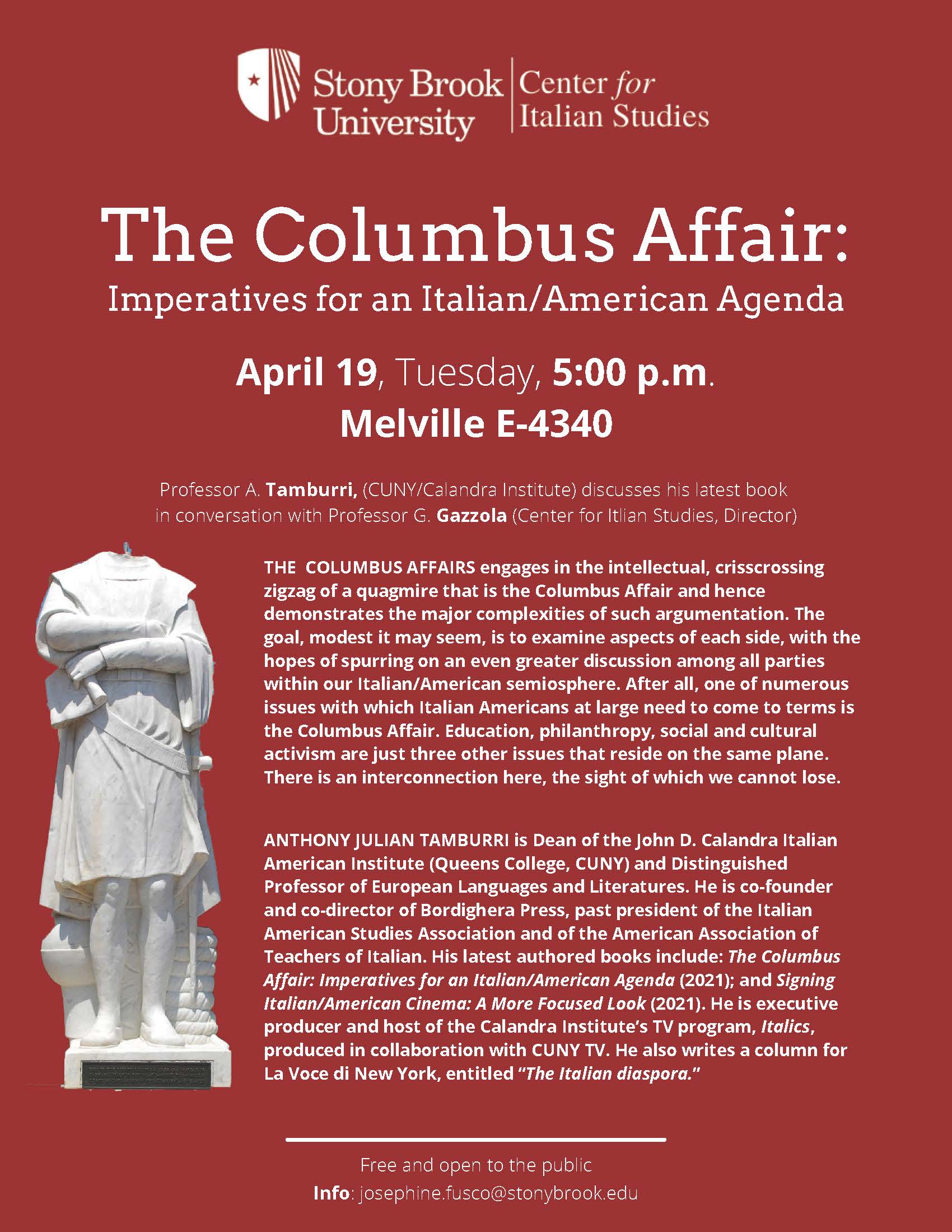 At Stony Brook University’s Center for Italian Studies, Calandra’s dean, Dr. Anthony Julian Tamburri, will be in conversation with the Center’s Director Giuseppe Gazzola about Dr. Tamburri’s recent book The Columbus Affair.